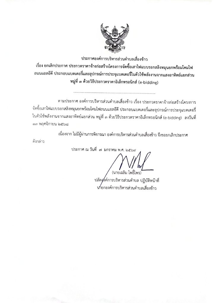 ยกเลิกประกาศ ประกวดราคาจ้างก่อสร้างโครงการจัดซื้อเสาไฟแบบรอกสลิงหมุนยกพร้อมโคมไฟถนนแอลอีดี หมู่ที่ ๓ ด้วยวิธีประกวดราคาอิเล็กทรอนิกส์ (e-bidding) 7 ม.ค. 25697 ม.ค. 2026อิฐิคุณ ไชย์รัตน์ข่าวจัดซื้อจัดจ้างและ e-GP ยกเลิกประกาศ ประกวดราคาจ้างก่อสร้างโครงการจัดซื้อเสาไฟแบบรอกสลิงหมุนยกพร้อมโคมไฟถนนแอลอีดี หมู่ที่ ๓ ด้วยวิธีประกวดราคาอิเล็กทรอนิกส์ (e-bidding)